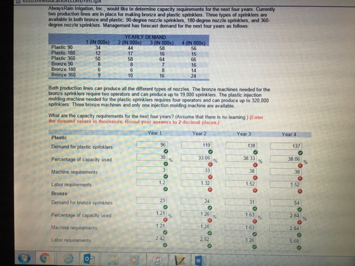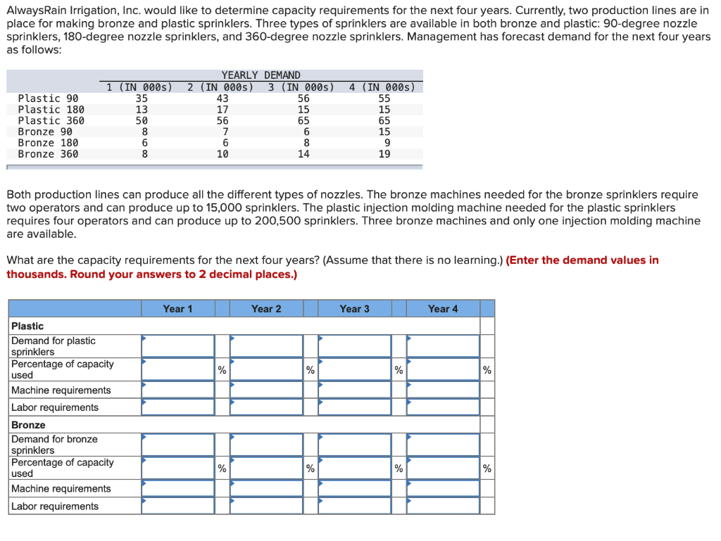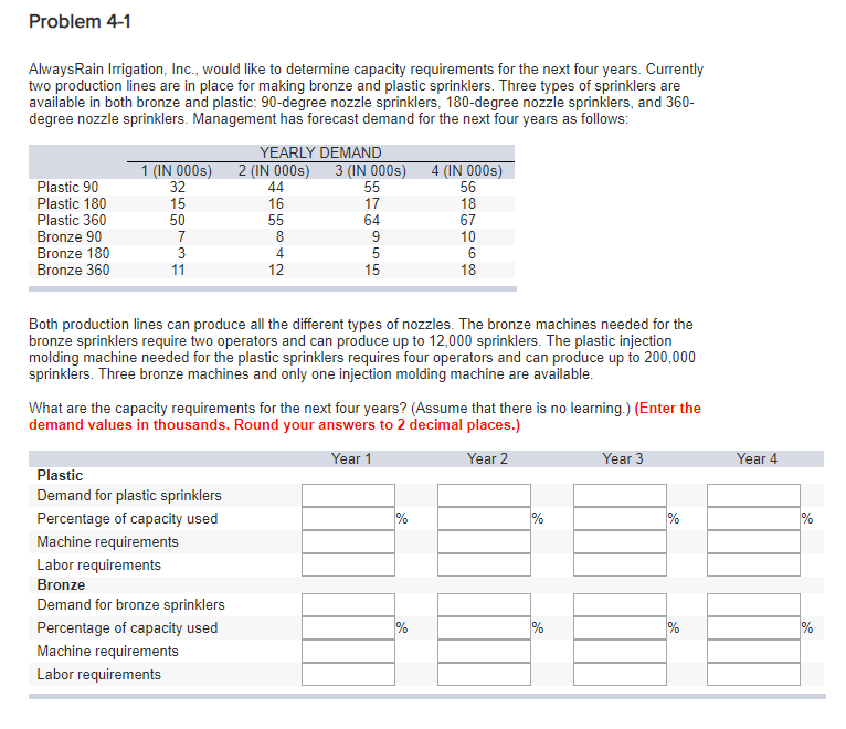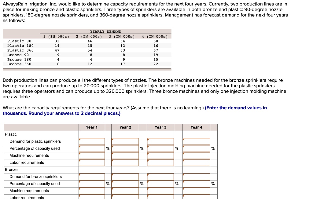 Alwaysrain irrigation inc would like to determine capacity. 90-degree nozzle sprinklers 180-degree nozzle sprinklers and 360-degree nozzle sprinklers. AlwaysRain Irrigation Inc would like to determine capacity requirements for the next four years.