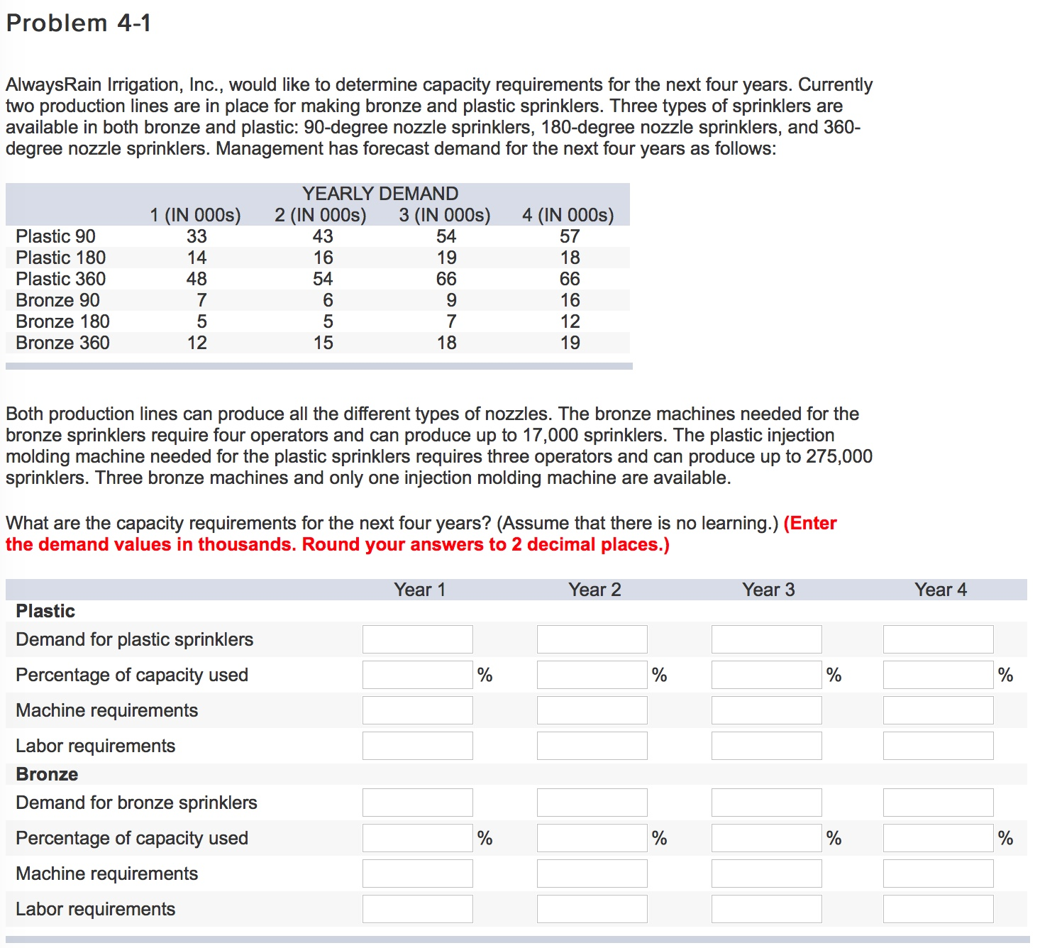 Problem 4-1 AlwaysRain Irrigation Inc would like to determine capacity requirements for the next four years. AlwaysRain Irrigation Inc would like to determine capacity requirements for the next four years. Three types of sprinklers are available in both bronze and plastic.