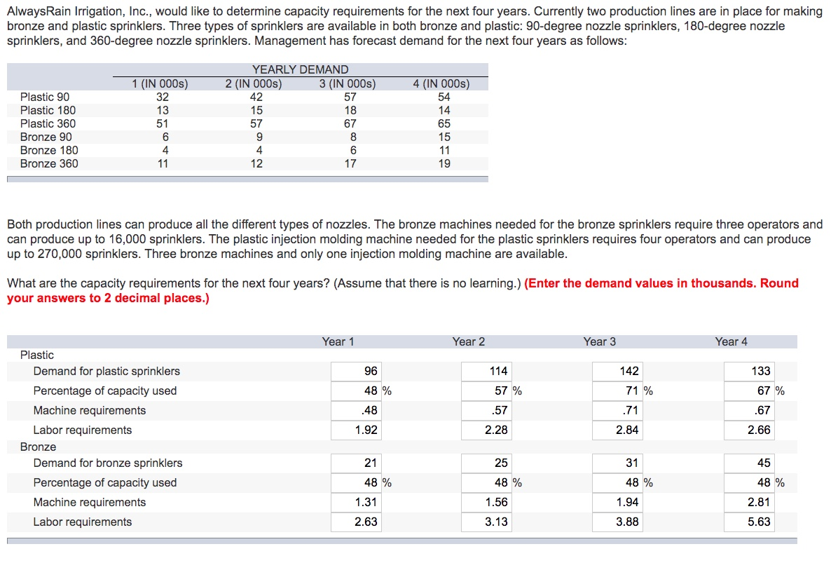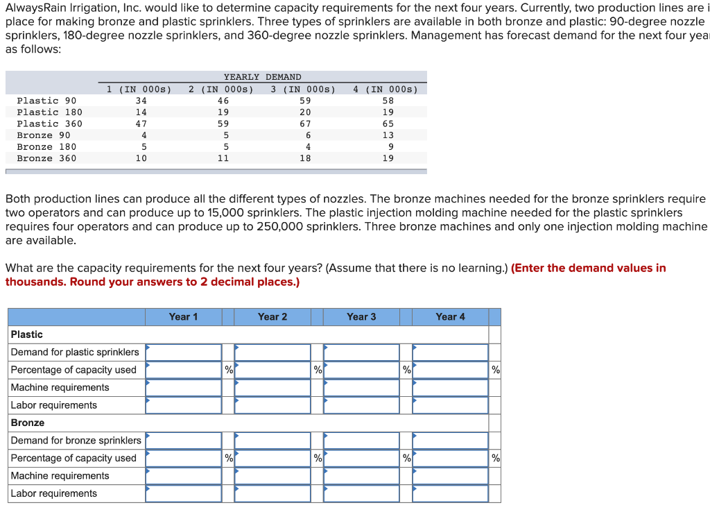 Currently two production lines are in place for making bronze and plastic sprinklers. AlwaysRain Irrigation Inc would like to determine capacity requirements for the next four years. 90-degree nozzle sprinklers 180-degree nozzle sprinklers and 360-degree nozzle sprinklers.