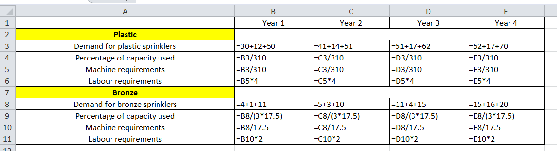 Currently two production lines are in place for making bronze and plastic sprinklers. AlwaysRain Irrigation Inc would like to determine capacity requirements for the next four years.